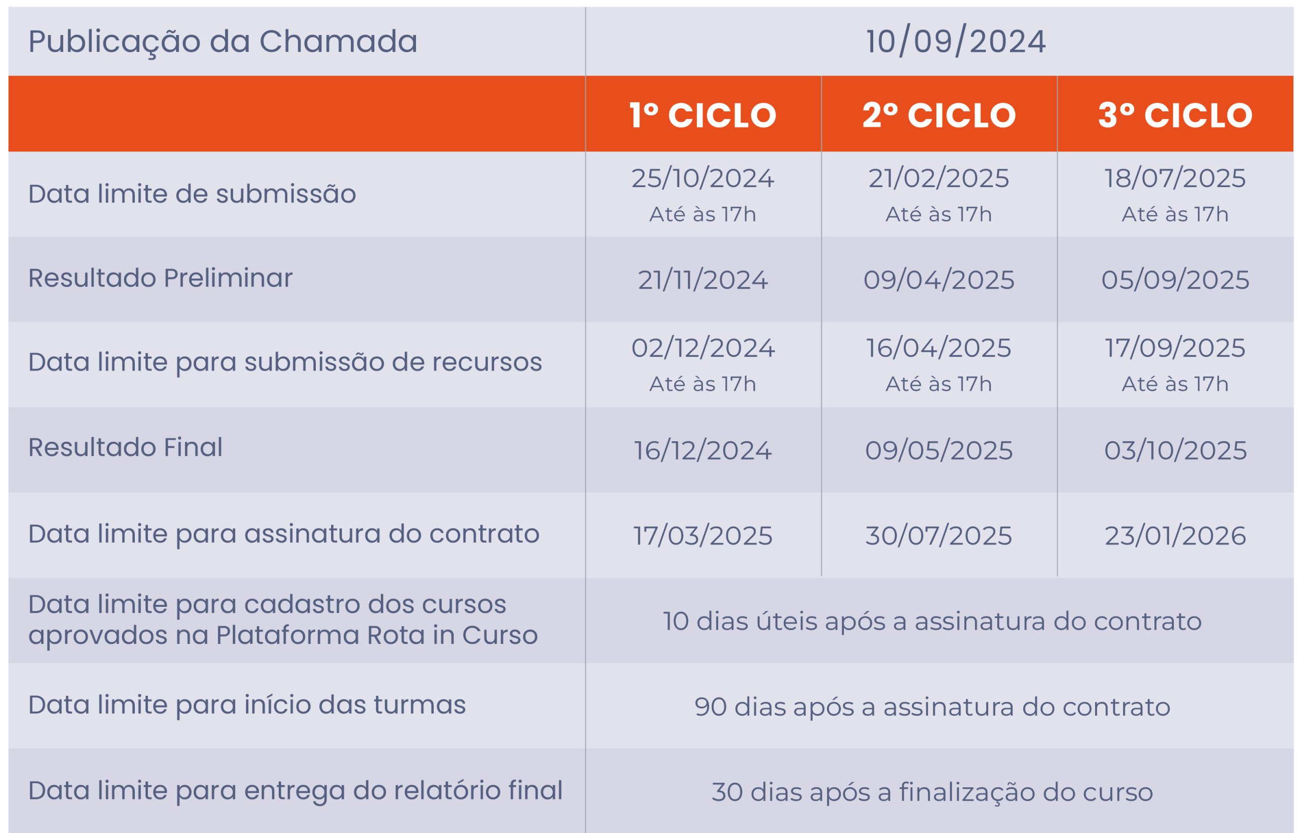 A Chamada é organizada em 03 (três) ciclos de avaliação, com fluxo contínuo de submissão conforme cronograma abaixo:
